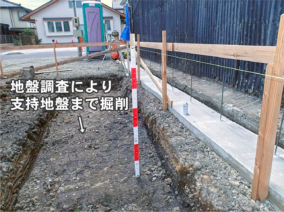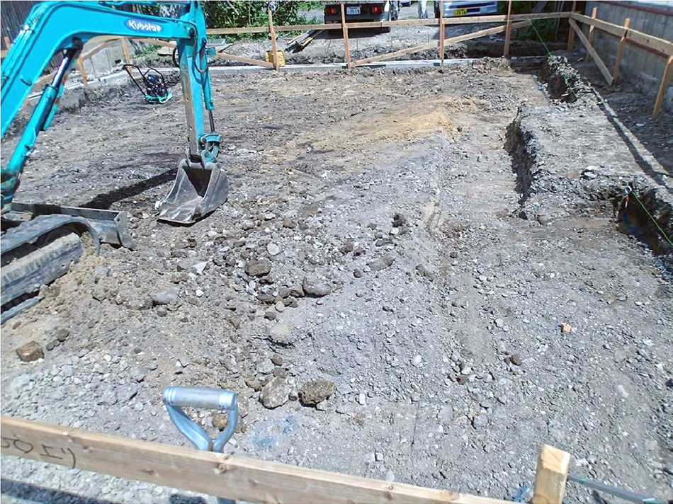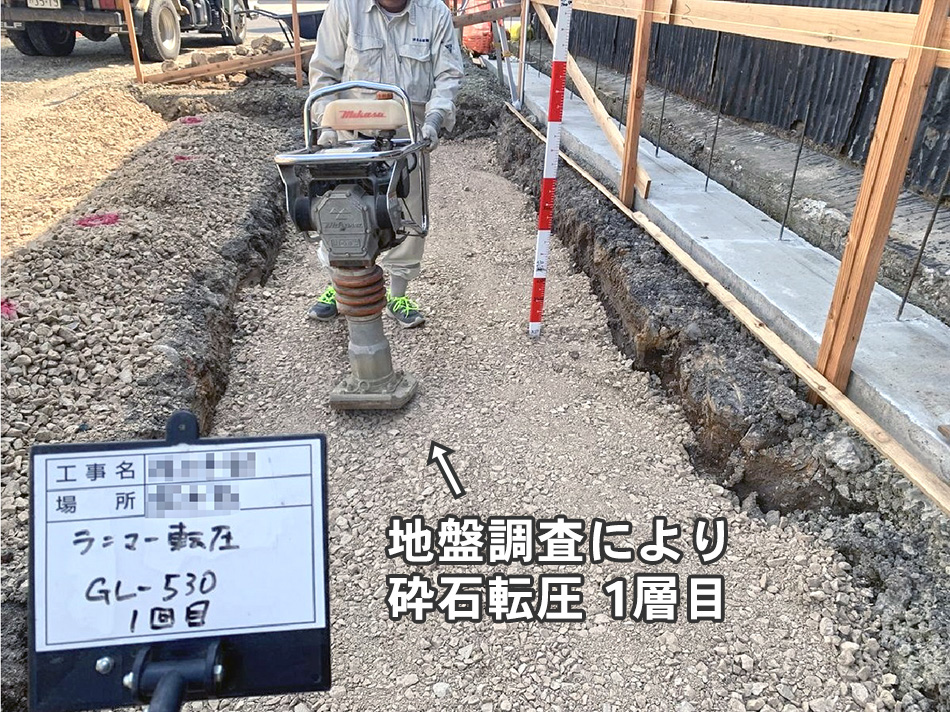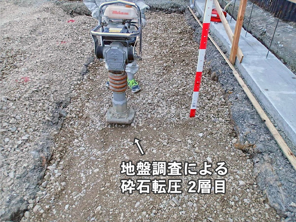 地盤調査により軟弱地盤撤去→砕石を敷き込み締固め